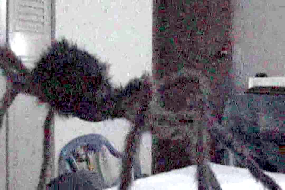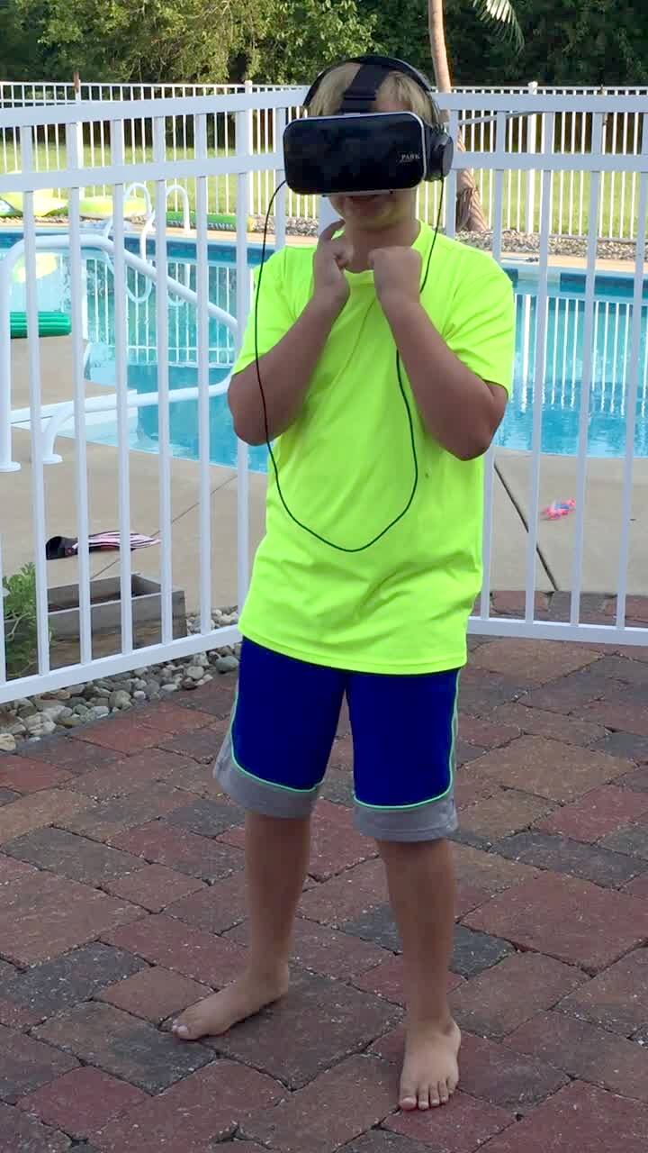 A mother plays a virtual reality video game while her son gives her instructions as he records her. She punches the camera lens by mistake, and he drops the camera.