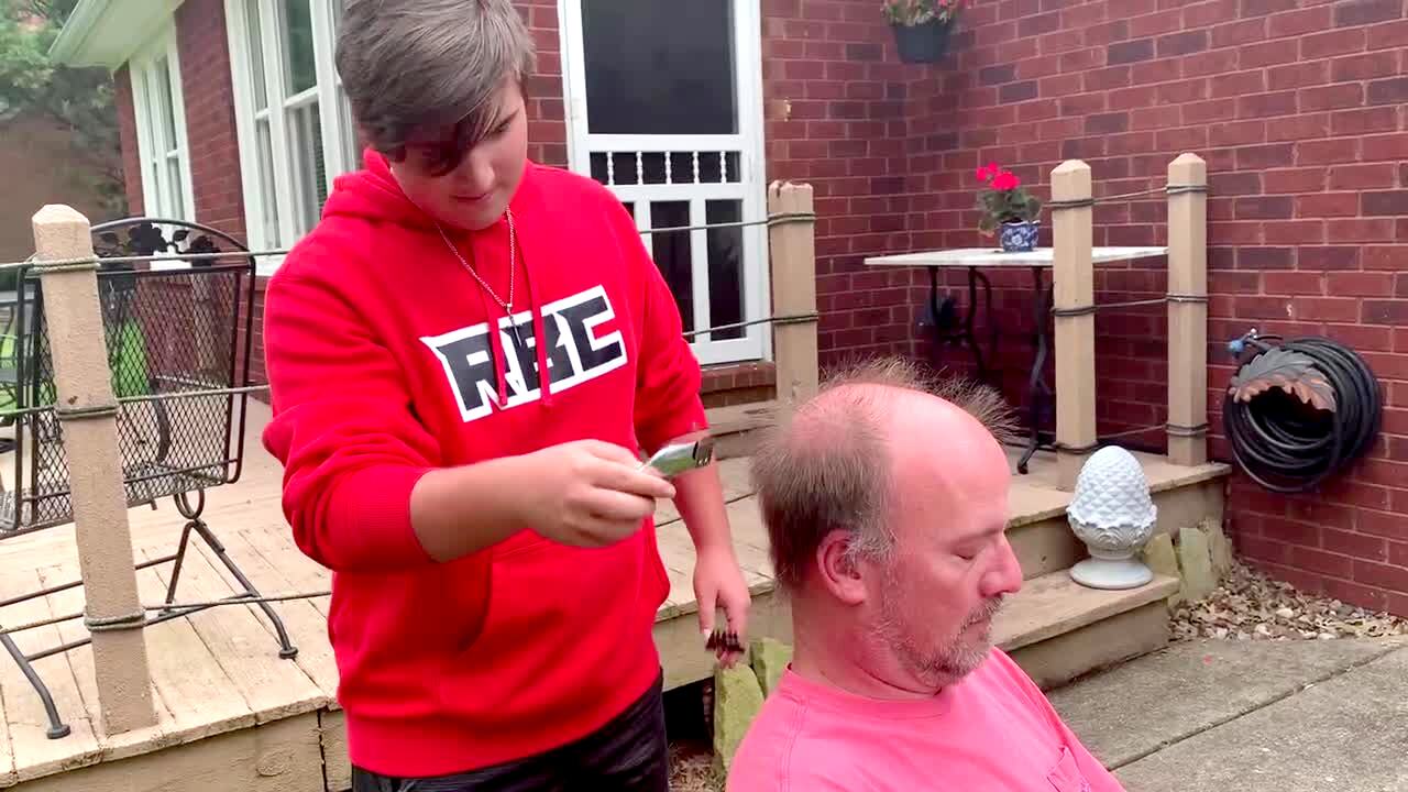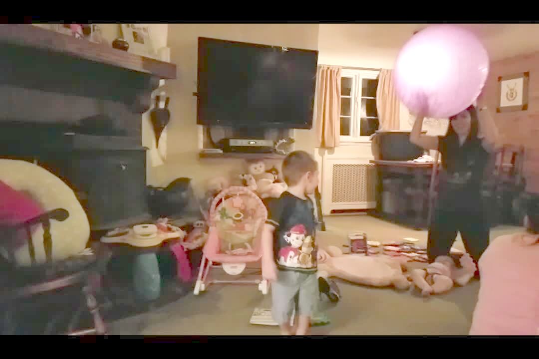 A young girl hits a wiffleball that hits her father in the head while he sits in a lawn chair in the yard. It ricochets off his head and flies offscreen.