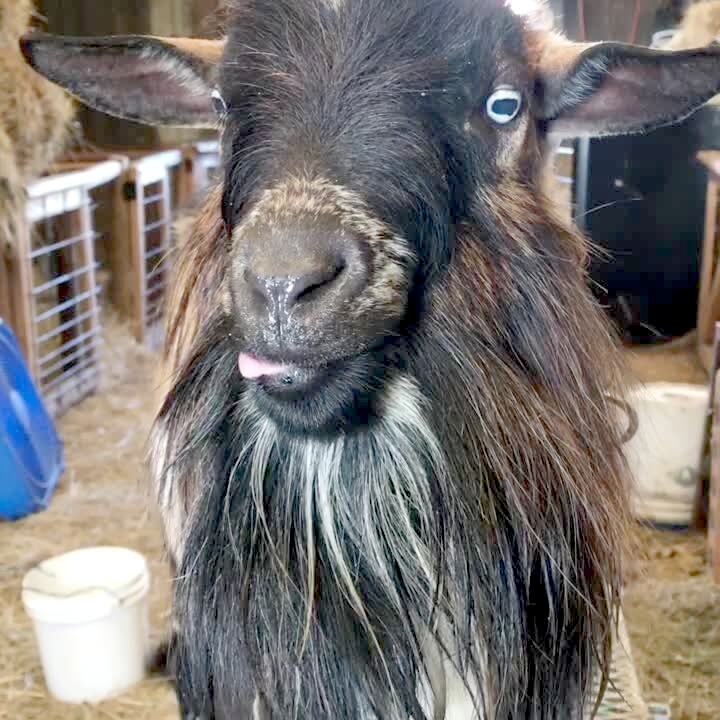 A pug dog licks its lips in slow motion with a long tongue at home.