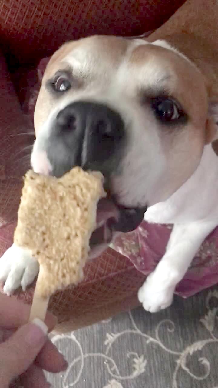 A dog makes a peanut butter sandwich at a kitchen counter and eats it.