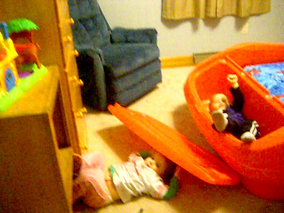 A baby girl leans over the hoods of a race car bed, flips over onto the floor, and her twin brother pops out of the hood.