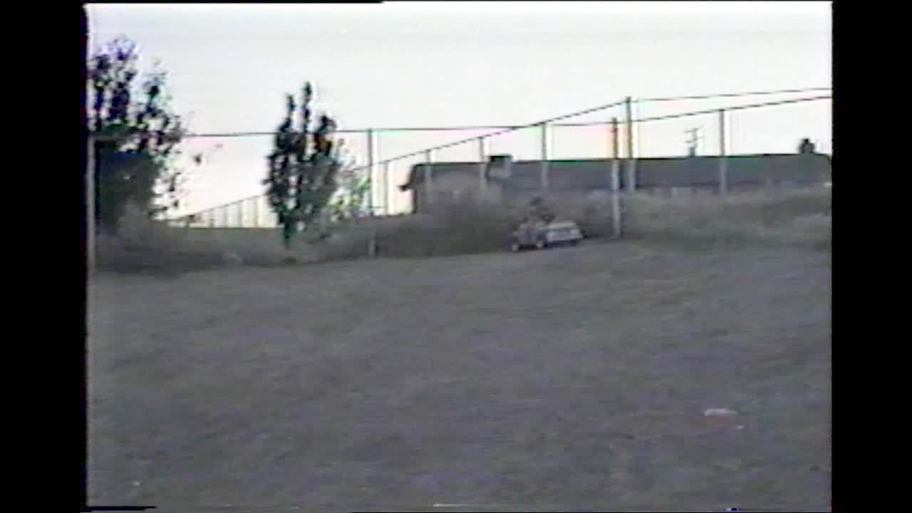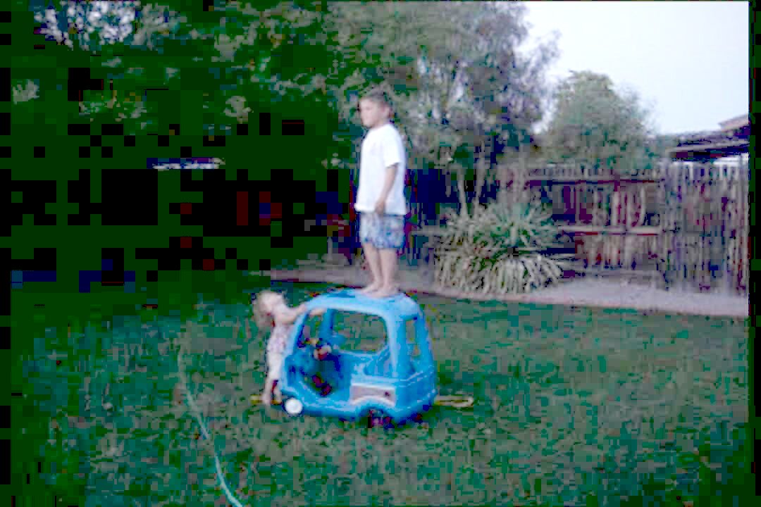 Tot girl drives a green Jeep around the yard with her little brother in the back seat. Boy stands up, girl drives faster, & boy falls out of Jeep. Short tail, no recovery. Boy cries. Power Wheels.