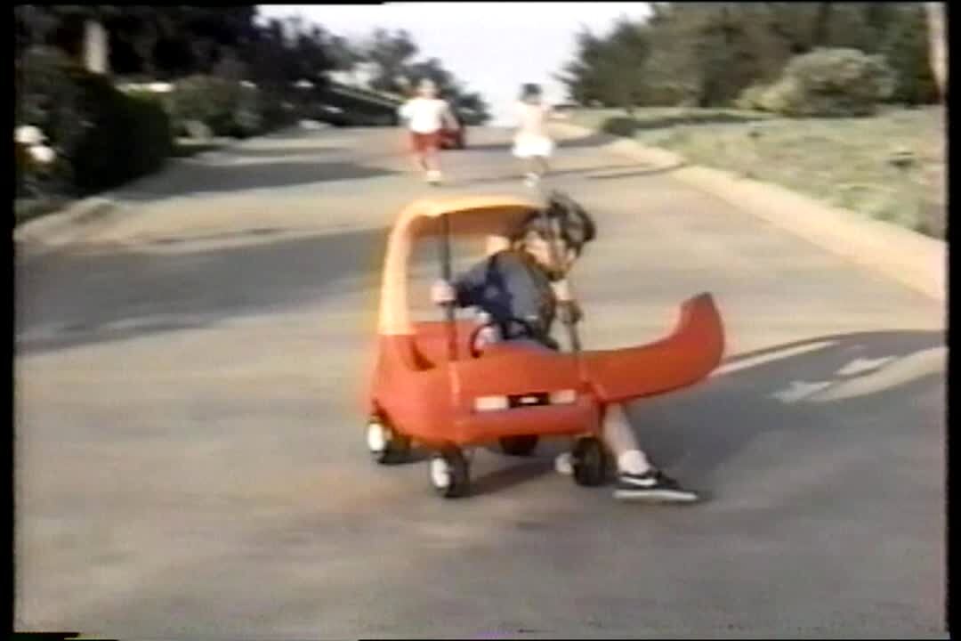 A boy instructs his tot sister on how to drive a power wheels car while he rides behind her in a trailer wagon, then hops into the car to push the gas for her when she can't figure it out. He steps back into the wagon when she hits the gas and he falls out and gets run over.