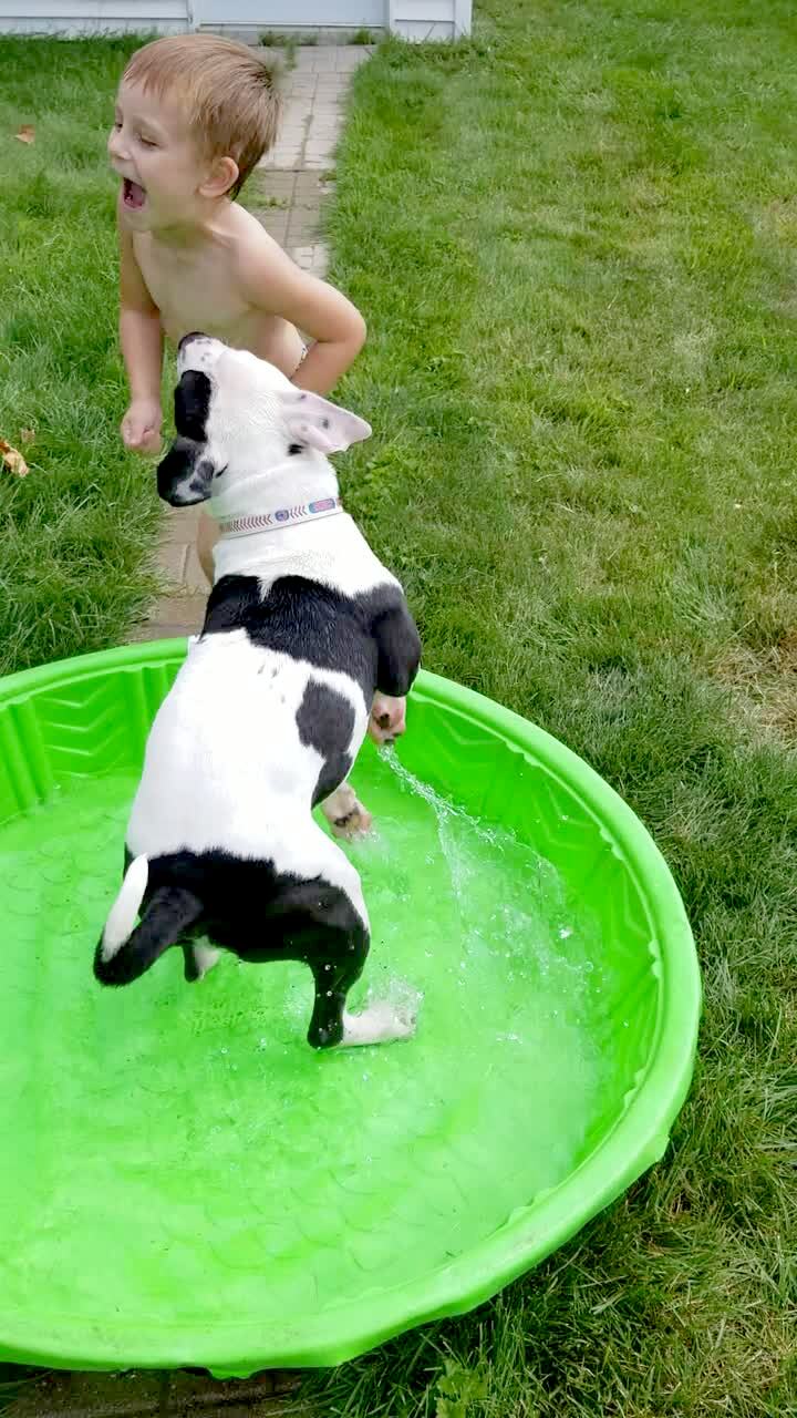 A woman goes down a small inflatable slide and scorpions into the ground. When she looks up she has a mouth full of grass.