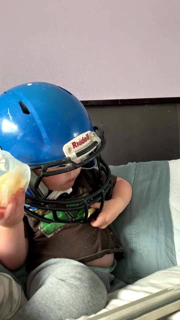 A tot boy struggles to get a Cheeto through his football helmet in the living room. When he finally gets the snack a woman tells him "good job".