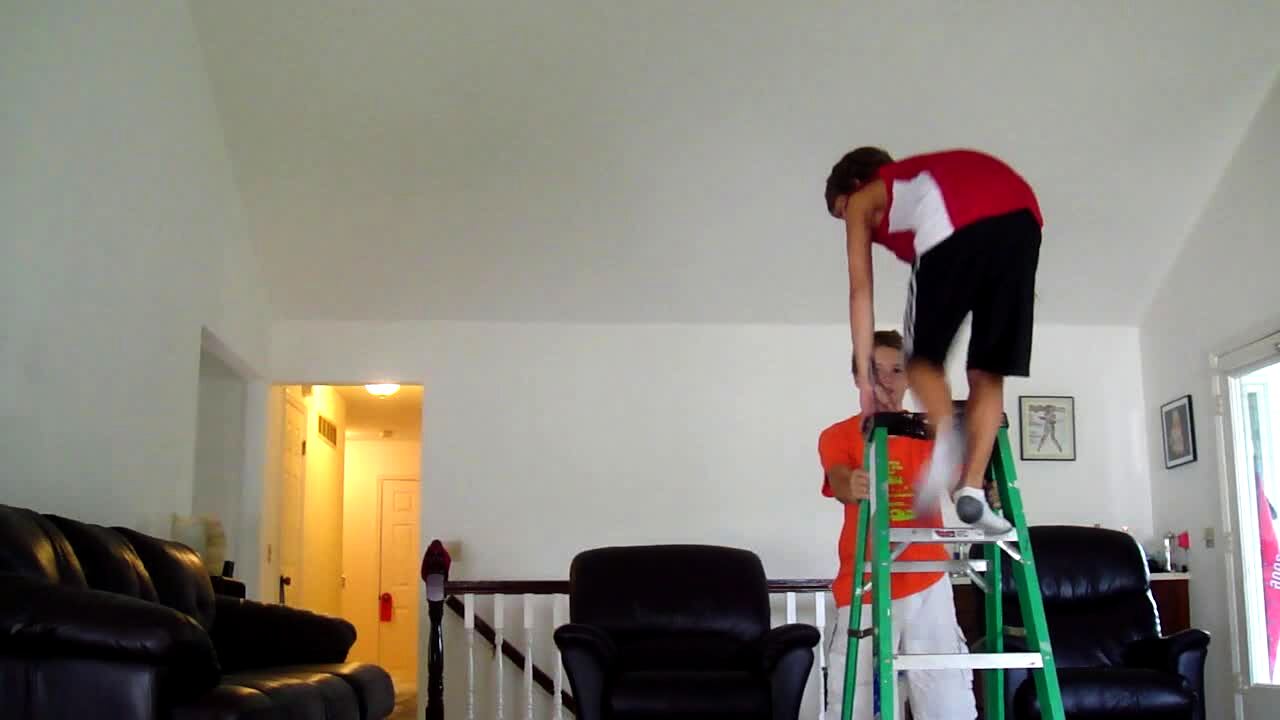 Teen boy jumps from a ladder to a couch in the living room and falls hard, head first, to the floor.