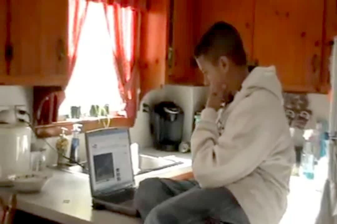 Teen boy sits on kitchen counter. Watches computer screen, is scared by email prank / scary image, falls off counter.
