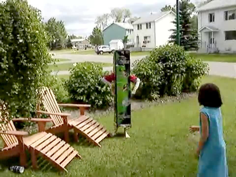 As a young boy plays a virtual reality game, a young man goes close to his groin and shoots him with a nerf gun down there. The boy falls off his chair in pain.