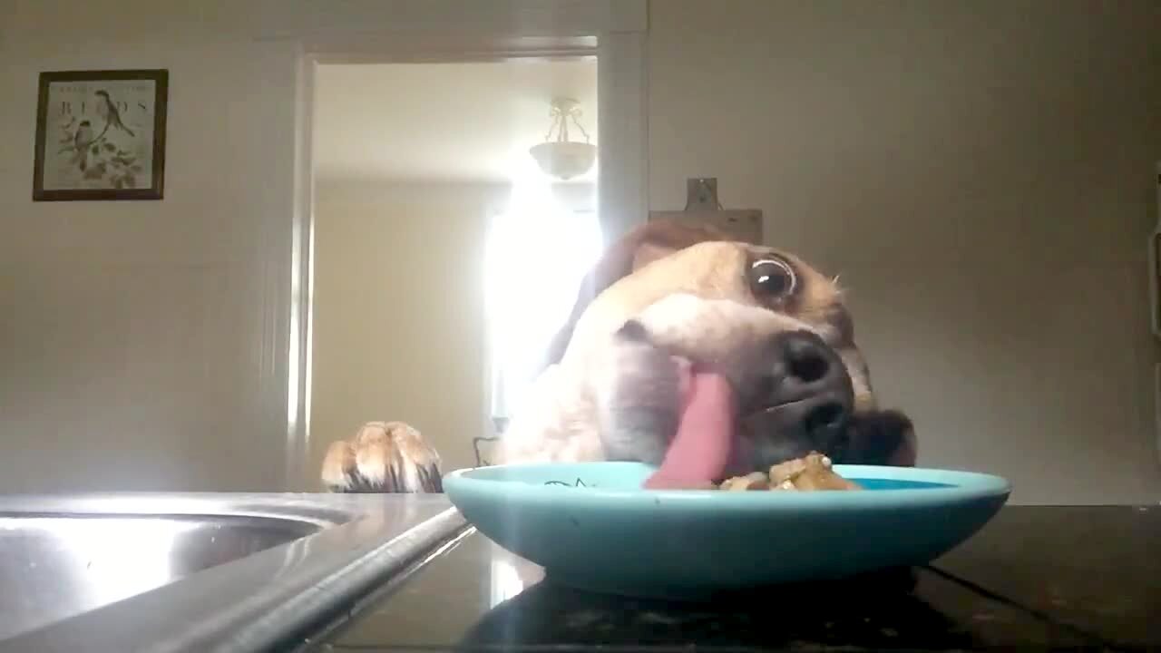 An adult does the Borrowed Hands challenge with a dog who eats a bowl of yogurt. Set to music.