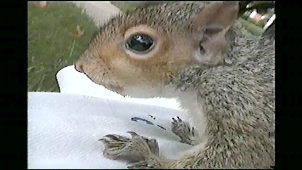 A man tries to capture a squirrel that has gotten into a fireplace with a plastic box. The squirrel jumps over the plastic box and runs into the kitchen and the man says "Jesus Christ". The squirrel runs across a cupboard and climbs into a jar which helps the man capture the squirrel and release it outside.