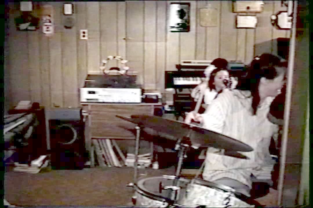 Young boy plays guitar, says "I'm in a rock band." He falls off the stool he is sitting on.