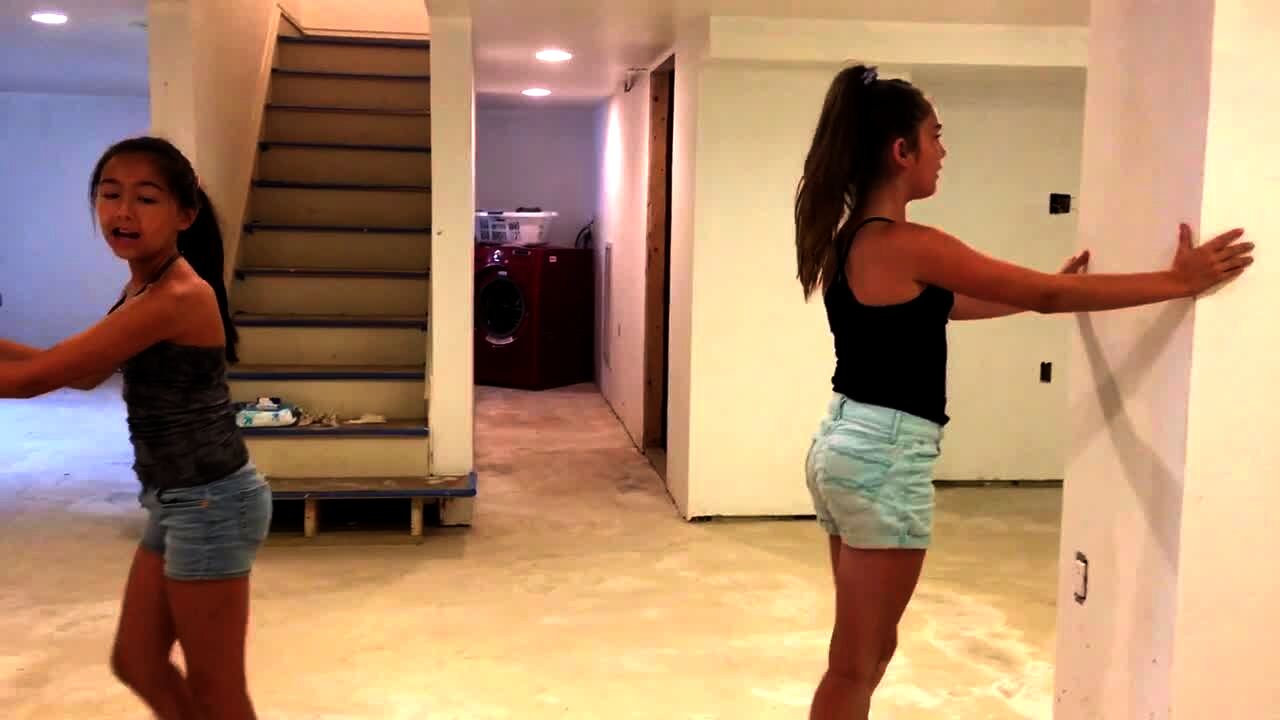 A young girl tries to slide down into the splits but falls forward and lands on her face in the basement.