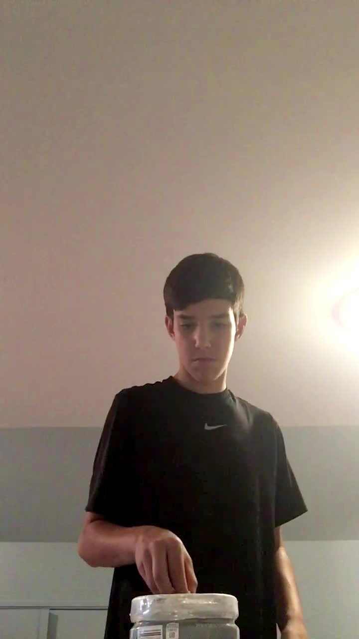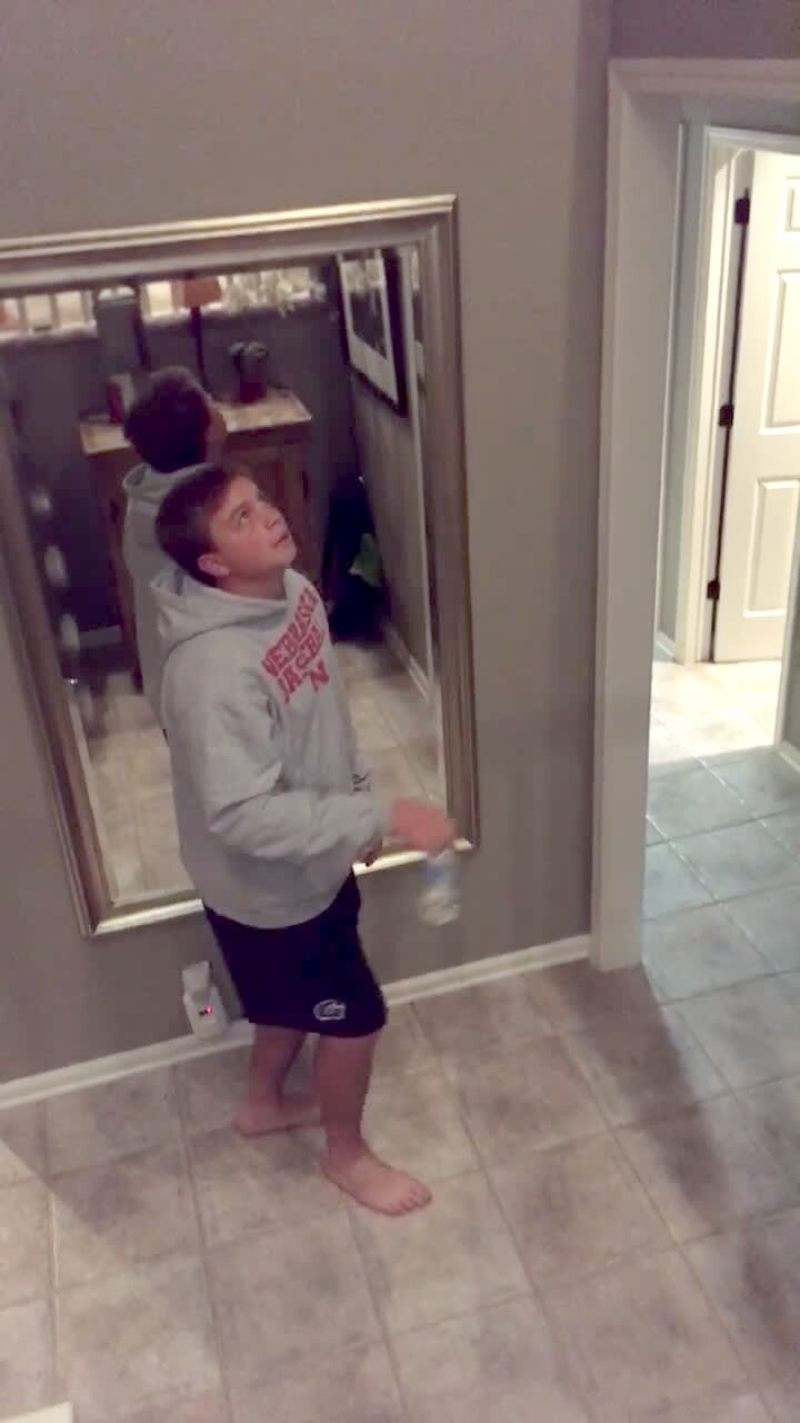 A teen boy flips a Gatorade bottle and it lands upside down. Then he flips a water bottle and it lands right side up on top of the Gatorade bottle.