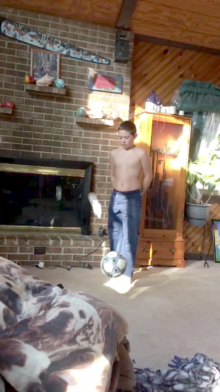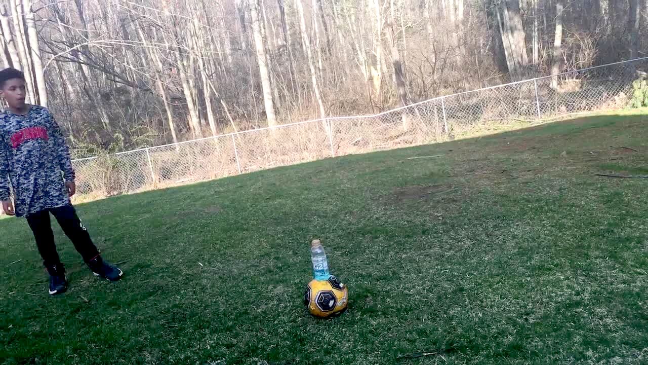 A teen boy kicks a soccer ball with a water bottle balanced on it. The water bottle flips and lands.