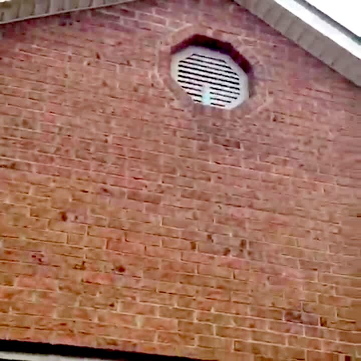Boy holds a trampoline in the driveway, another boy bounces a basketball on it. The ball flies over his head & goes into the hoop far behind him in the backyard. Amazing shot.