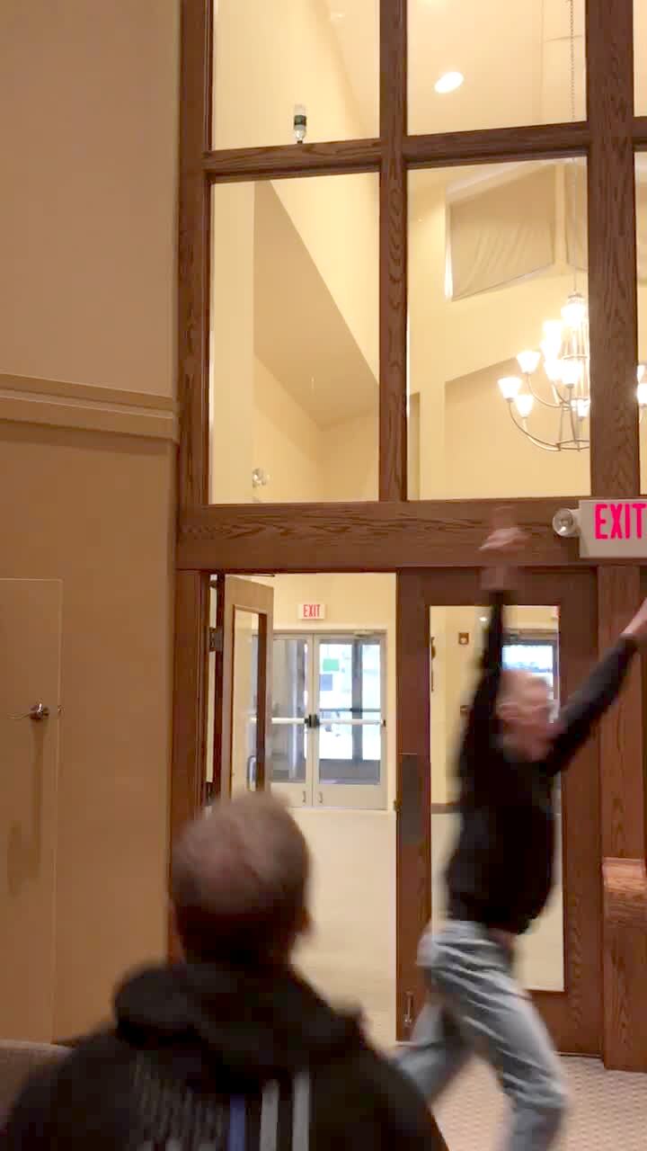 A teen boy flips a water bottle up onto a window sill in a church.