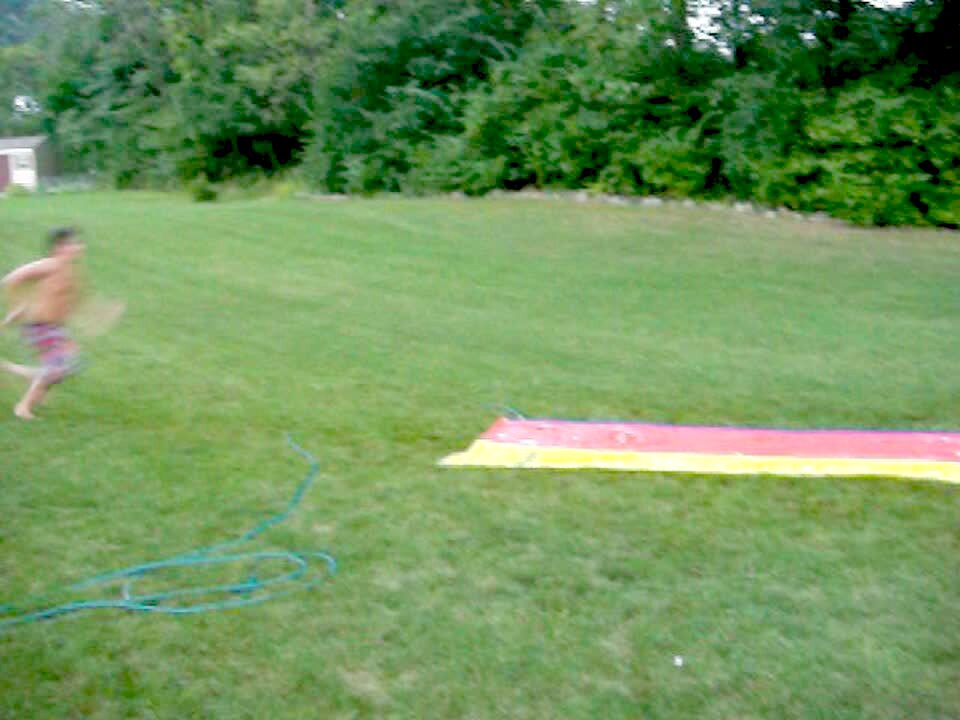 A young boy runs with a boogie-board and tries to jump and slide into a flooded backyard but the nose of the board digs into the ground and he flips over and falls in the water.