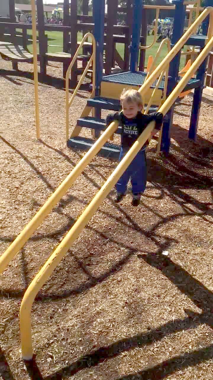 A tot boy drinks water out of a plastic bottle while sitting on a toy tractor outdoors. He leans forward to set the water bottle down when he loses his balance and smashes his head into the tractor steering wheel while simultaneously crushing the water bottle. Vine/instagram.