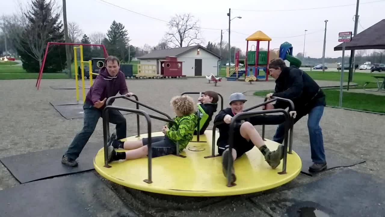 Three young boys sit on a merry go round at a playground. Two men stand and spin it around in slow motion video. One boy falls off and flies into one of the men's legs. The man falls down.