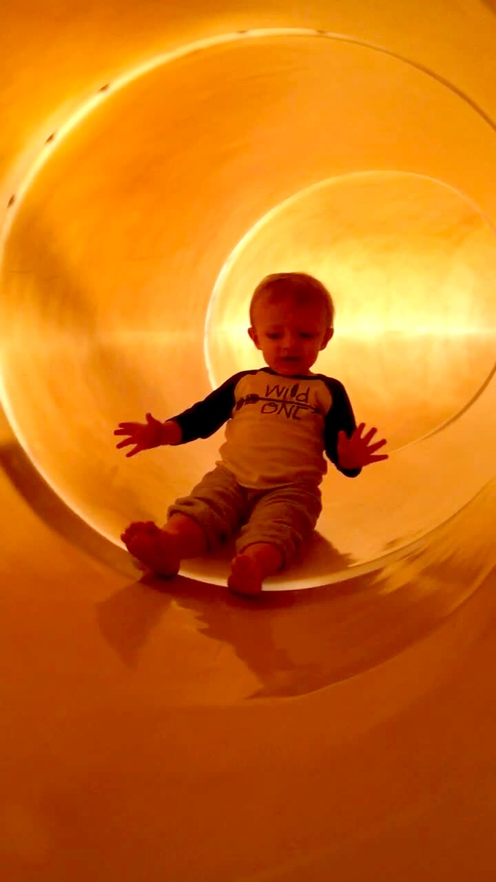A tot boy says "yeah" while he rides down a slide, but he goes very slow all the way down.