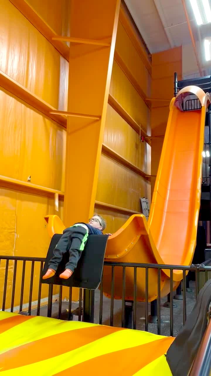At a Play Zone, a young boy goes down an indoor slide on a mat where he’s supposed to launch in the air when he reaches the bottom. Instead when he get to the end, his legs dangles off the edge of the slide before he falls off. Featured talent cleared (the boy on the slide).