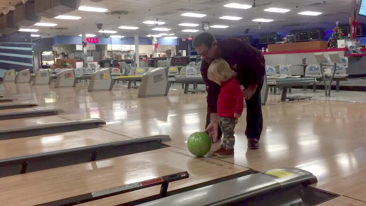 A man helps a young boy roll a bowling ball down a lane at a bowling alley and the boy runs after the ball and the man chases after him. The boy slips and falls and then the man slips and falls behind him.