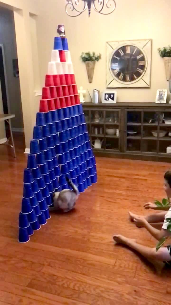 A young boy pushes a cat across the living room floor in slow motion and knocks down a tower of cups.