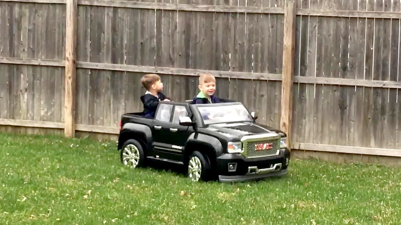 A tot boy stands up on the back of a power wheels car and falls off the car when his brother drives forward.