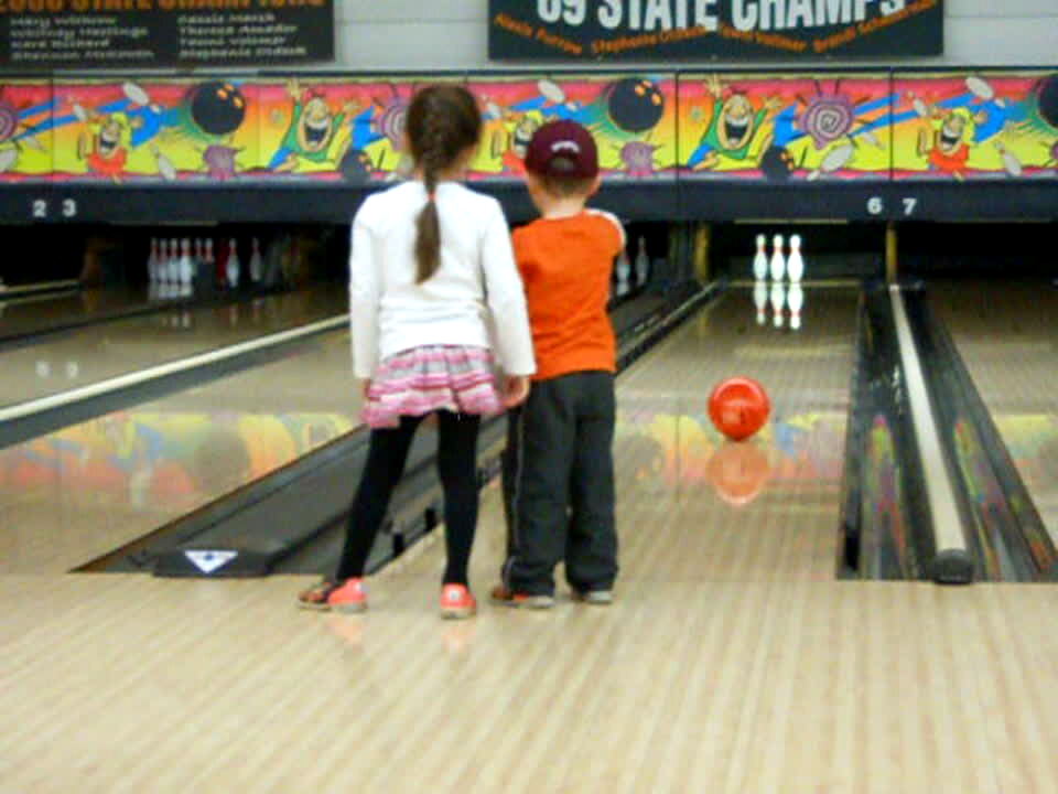 A tot boy and girl slowly roll a bowling ball down a lane in a bowling alley and just before the ball hits the pins, the gate comes down and stops it.