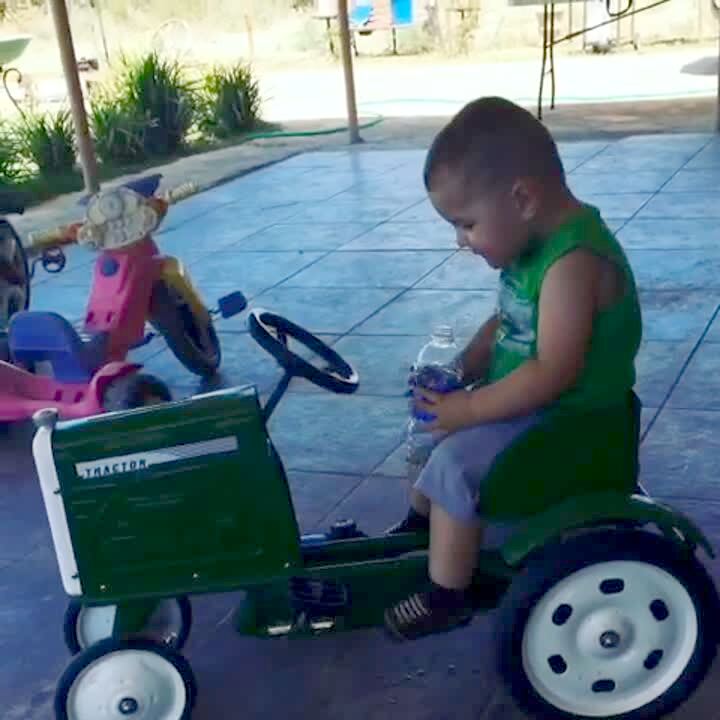 A tot boy drinks water out of a plastic bottle while sitting on a toy tractor outdoors. He leans forward to set the water bottle down when he loses his balance and smashes his head into the tractor steering wheel while simultaneously crushing the water bottle. Vine/instagram.