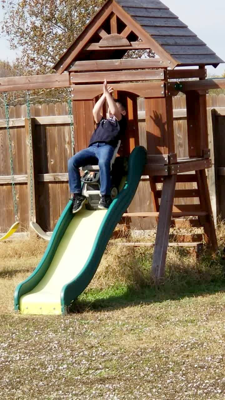 A tot boy climbs up a slide at a playground. When almost gets to the top he slips and says "Oh Nooooooooooo" as he slides down.