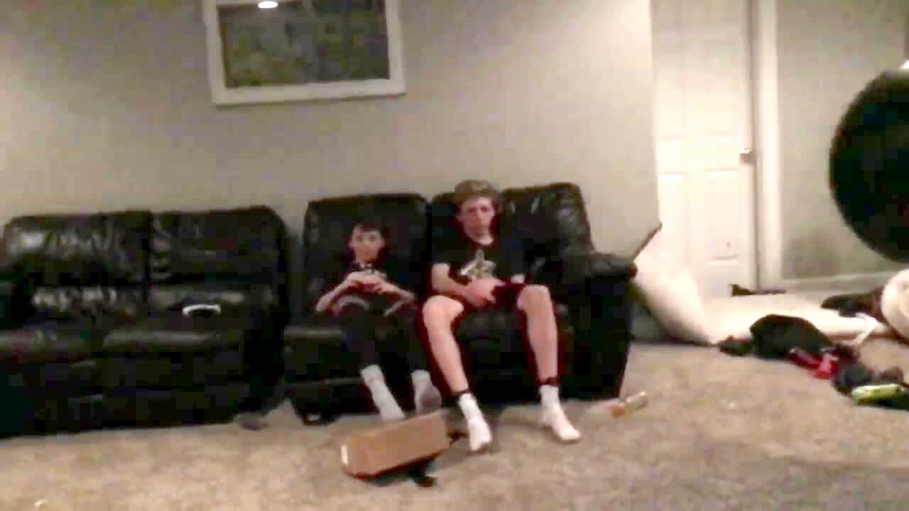 Two young boys run into each other in slow motion while they hold exercise balls. One boy bounces into the air and falls to the floor.