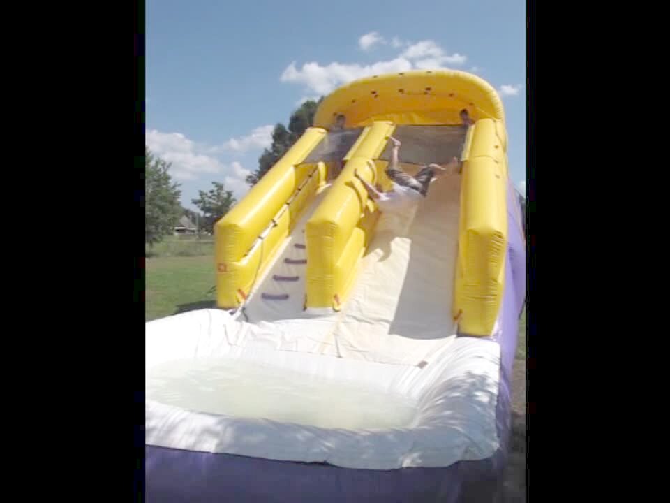 Man tries to do a trick on a large inflatable water slide, his legs get caught up and he flips to the bottom.