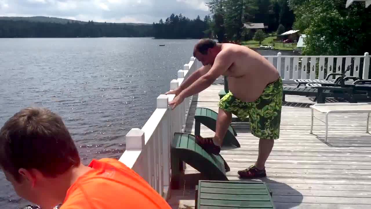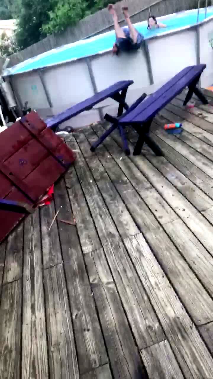 A man tries to jump from a picnic table into a swimming pool and the table falls out from under him as he starts to jump.