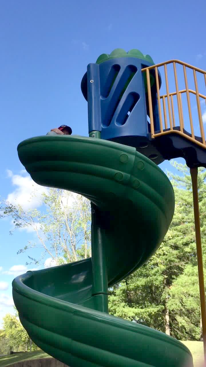 A man goes down a spiral slide with his dog and his butt gets wet when he goes through a puddle of water at the bottom.