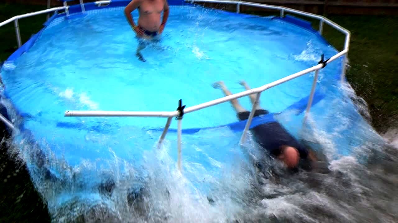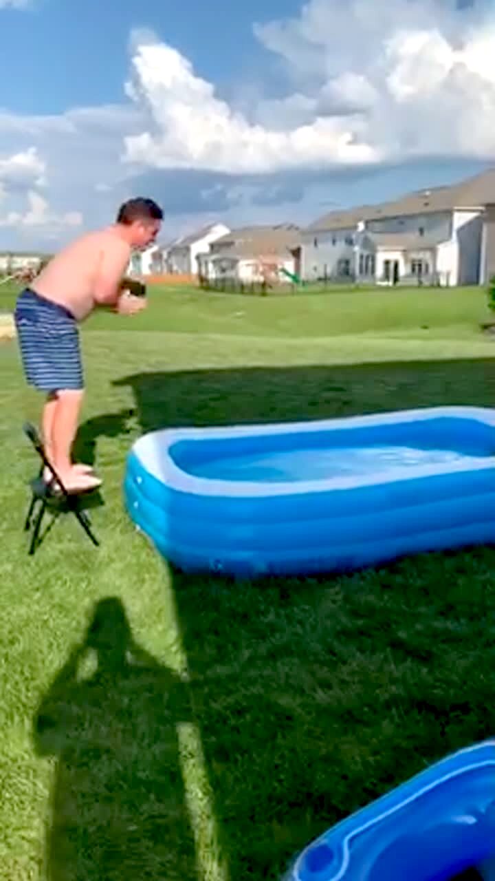 A man stands on a chair next to a kiddie pool in the yard. Right before he jumps into the pool, the chair breaks and he falls in the water.