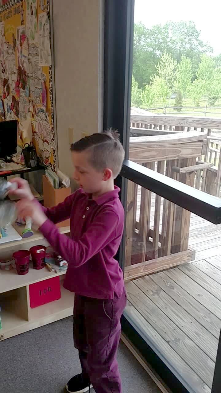 A young boy flips two bottles behind his back and they land on a small door bar that separates a window.