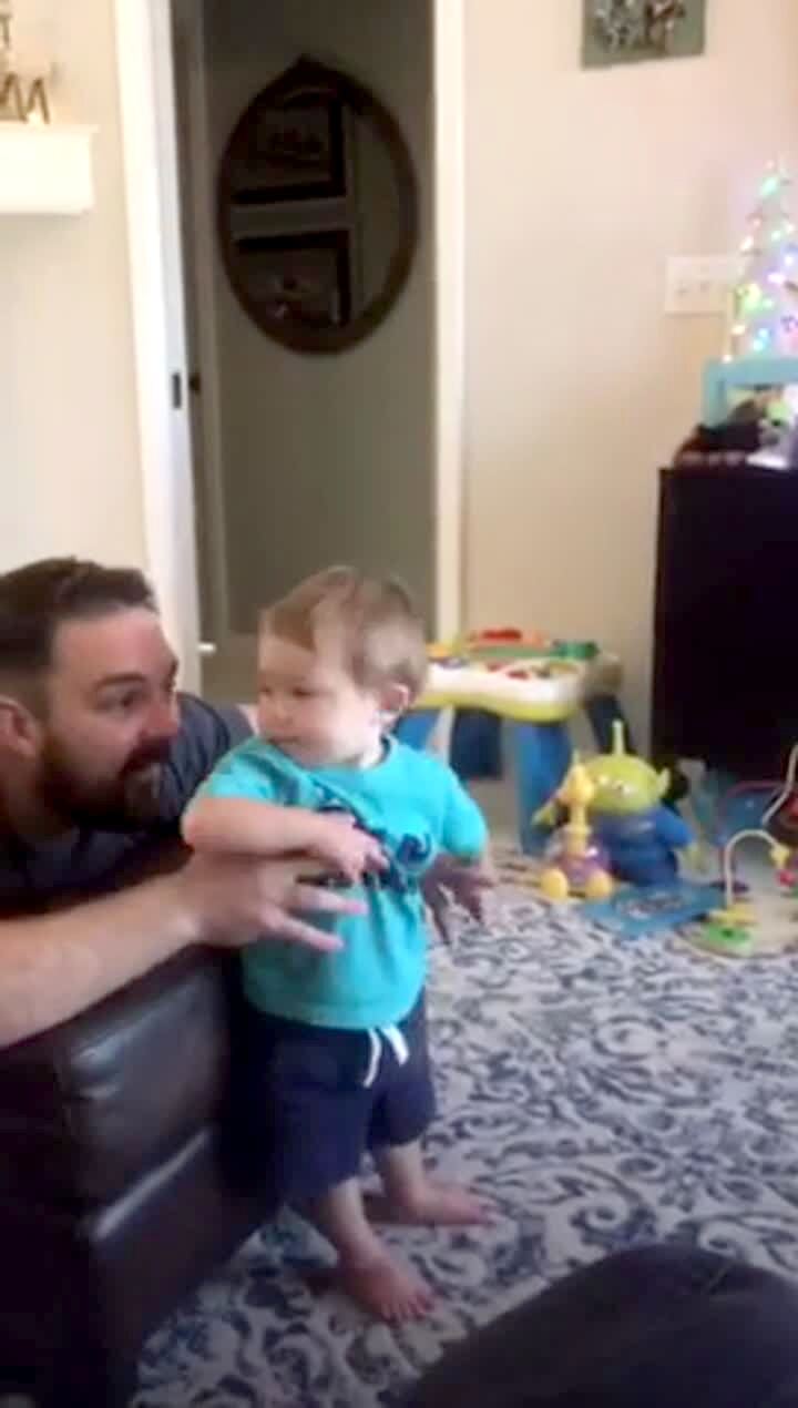 A man in a bedroom throws a young girl onto the bed. The dad says, "No more monkeys jumping on the bed!" However while he's distracted talking to the camera his daughter stumbles and falls off the bed and begins to cry.