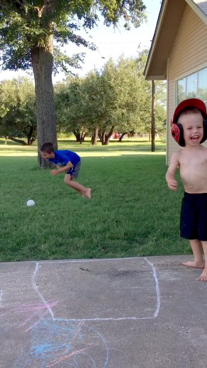 A young boy hits his older brother in the groin with a wiffle ball as they play baseball in a yard.