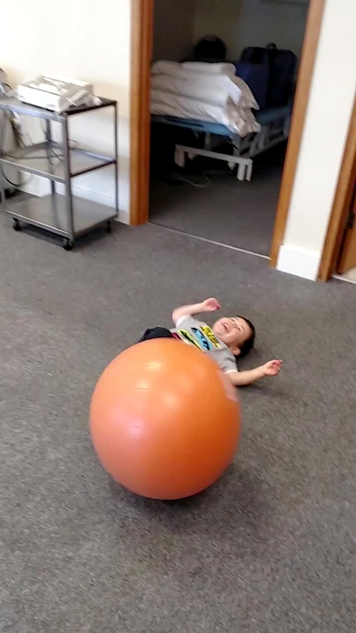 A tot boy throws an exercise ball in an office and it bounces off a pole and comes back to hit him in the face and he falls down.