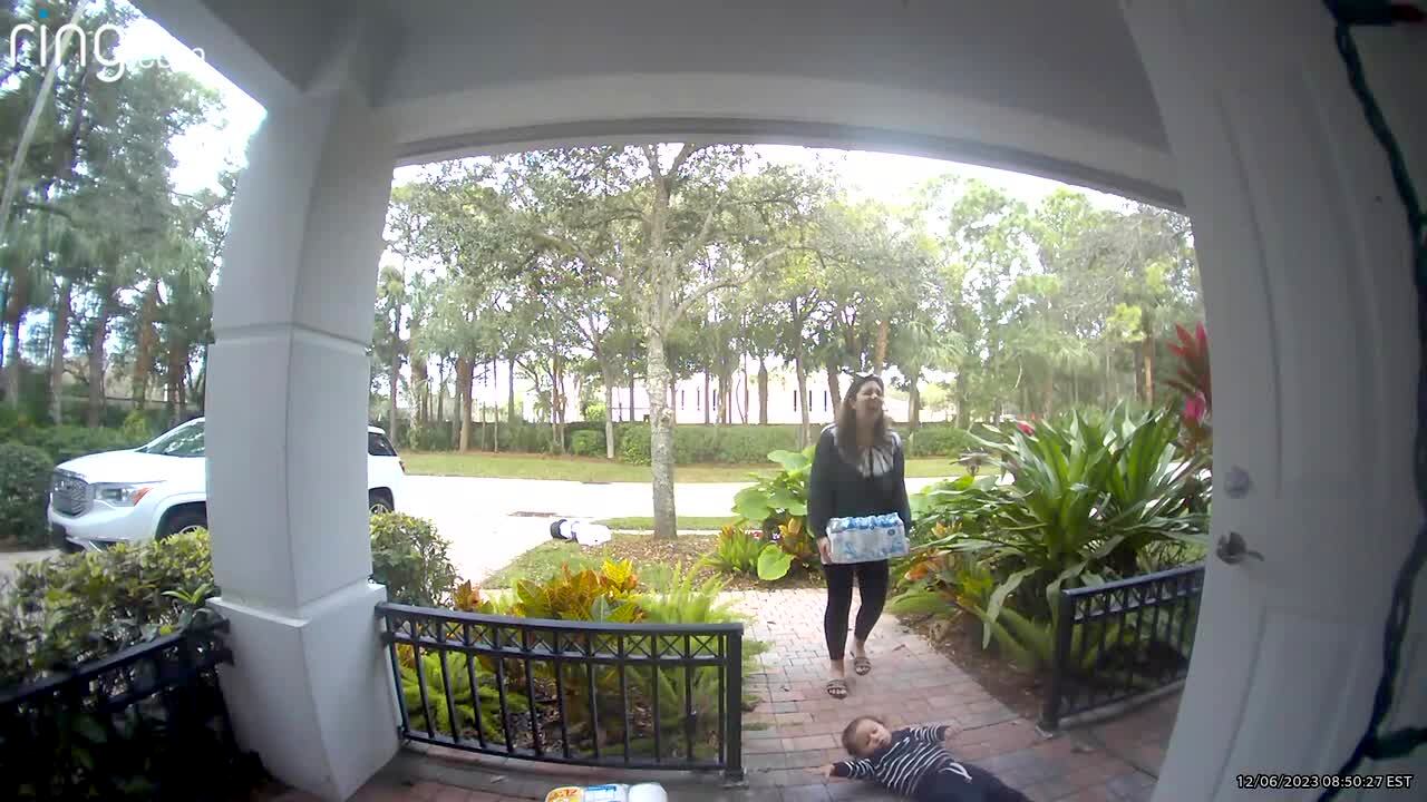 A young boy carries a pack of toilet paper then runs into the edge of the door and falls back onto porch. His mom starts laughing at him.