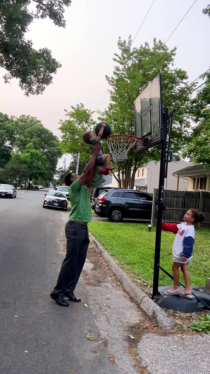 A man holds a tot boy up to dunk a basketball into a hoop in the driveway and the ball goes through and then comes down and hits his twin brother in the head.