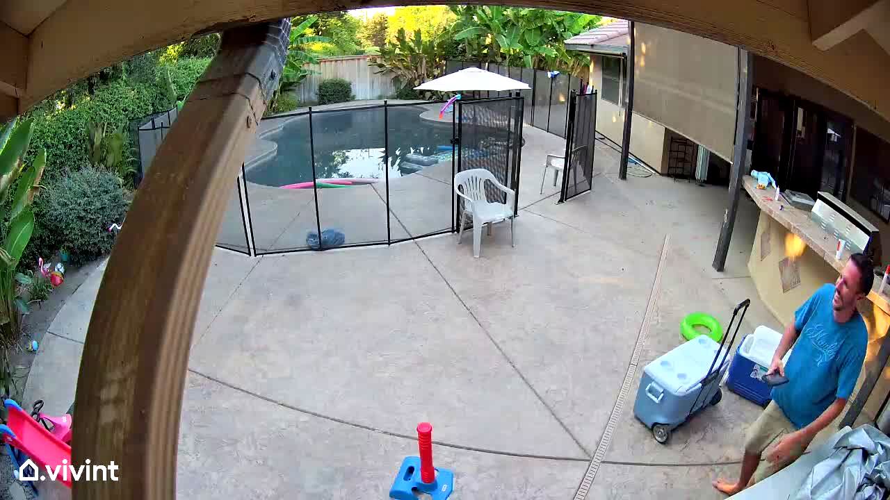 A young boy tosses a football back and forth with his dad in a basement. When he says, "tough guy," the ball bounces back and hits him in the head as he drops to the floor. Security footage.