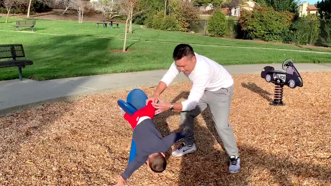 Man plays baseball with tot boy who hits the plastic ball right at his dad's head