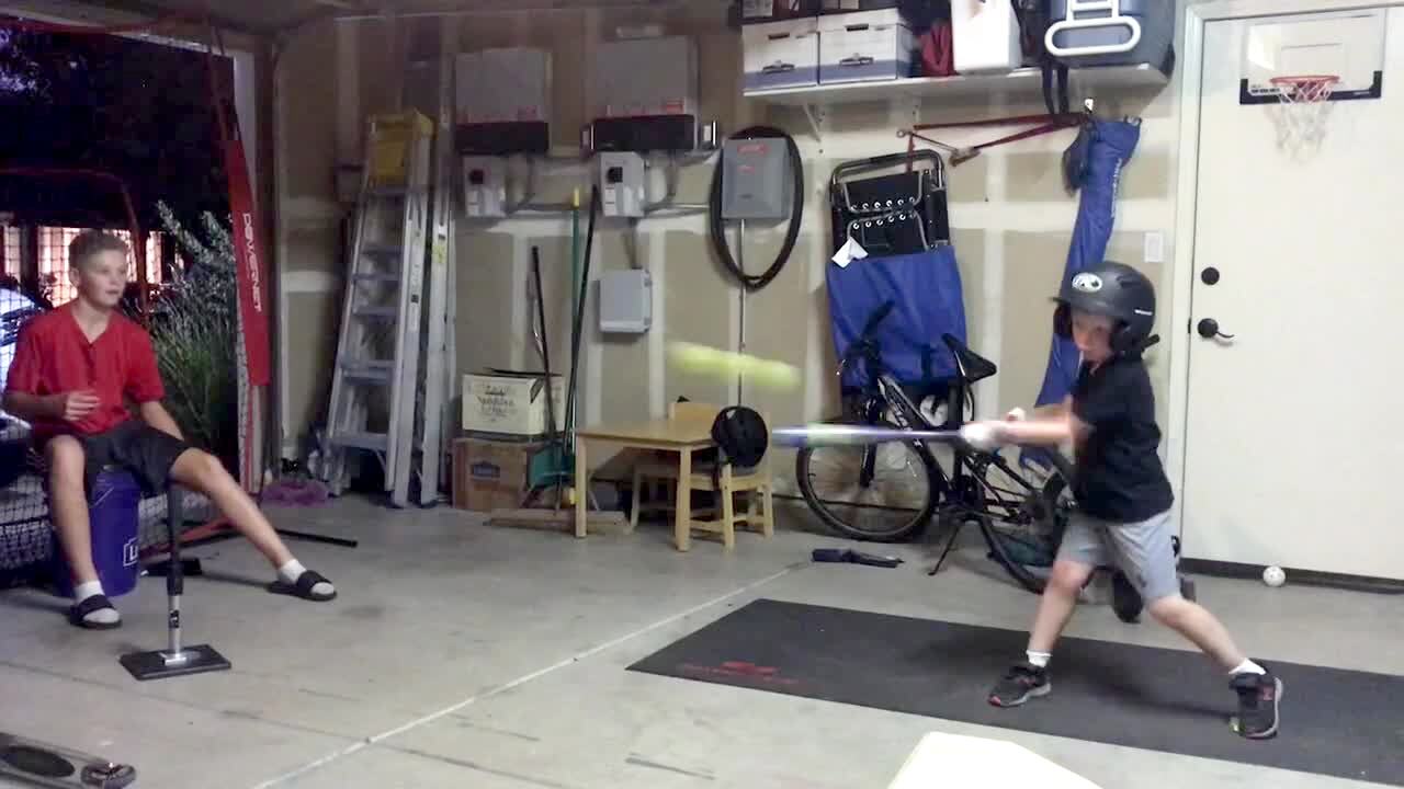 A young boy hits a ball in a garage and hits his older young boy brother in the face and he falls backwards into a net.