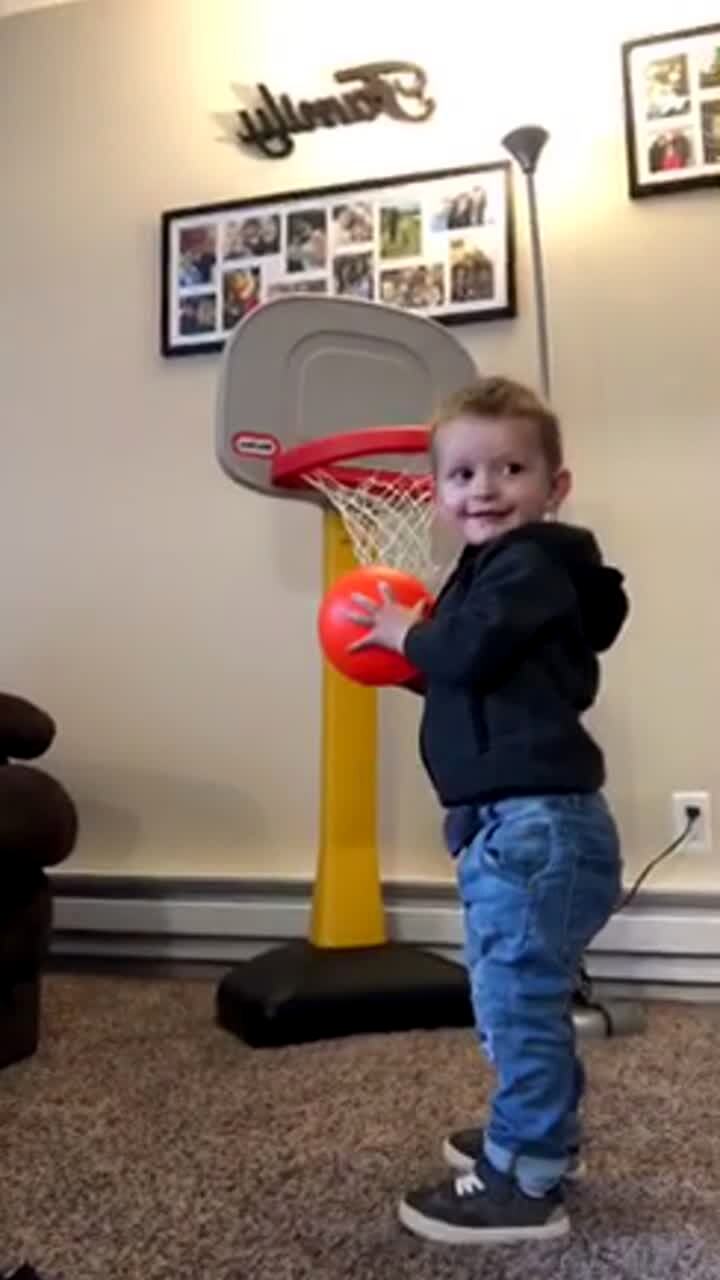 A tot boy knocks a picture frame off of the wall when he hits it with a rubber basketball as he tries to throw it in a toy hoop.