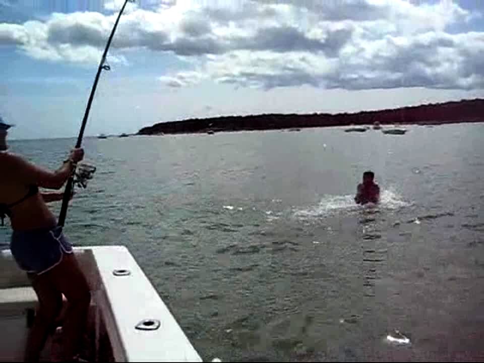 A woman goes to throw a clay pigeon disk for skeet shooting and accidentally hits a man with the disk.