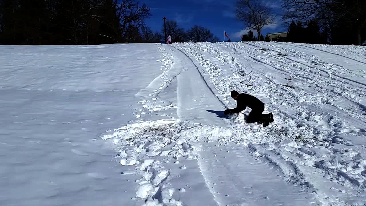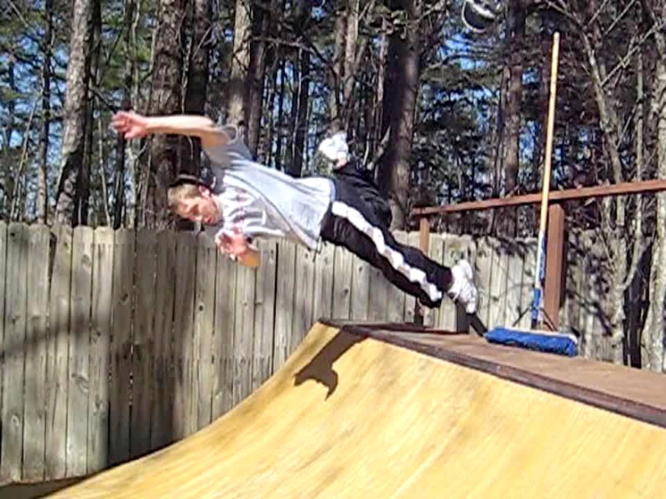 A man jumps on an old pogo stick on the driveway and it breaks and shoots a piece up into his groin.