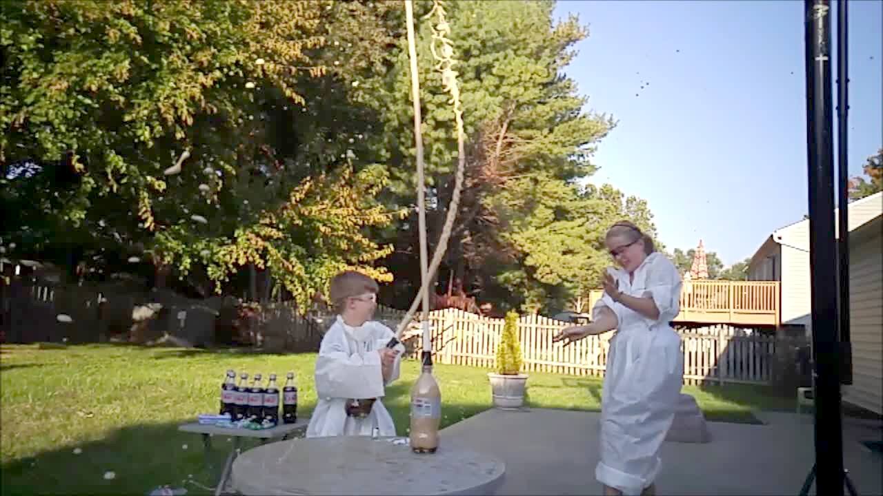 A man uses a nerf gun to shoot a chip out of his young son's mouth in slow motion.