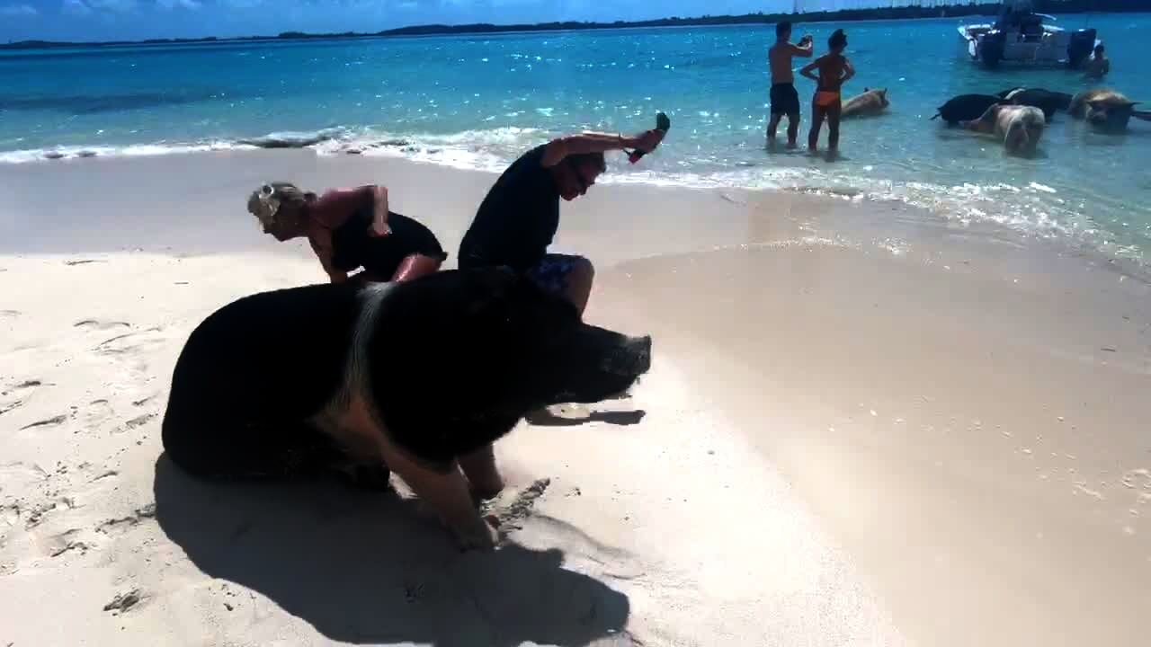 A man and woman pose for a picture on the beach with a large pig and the pig turns and bites at the man and he and his wife fall backward afraid. Featured talent cleared (the man and woman posing with the pig).